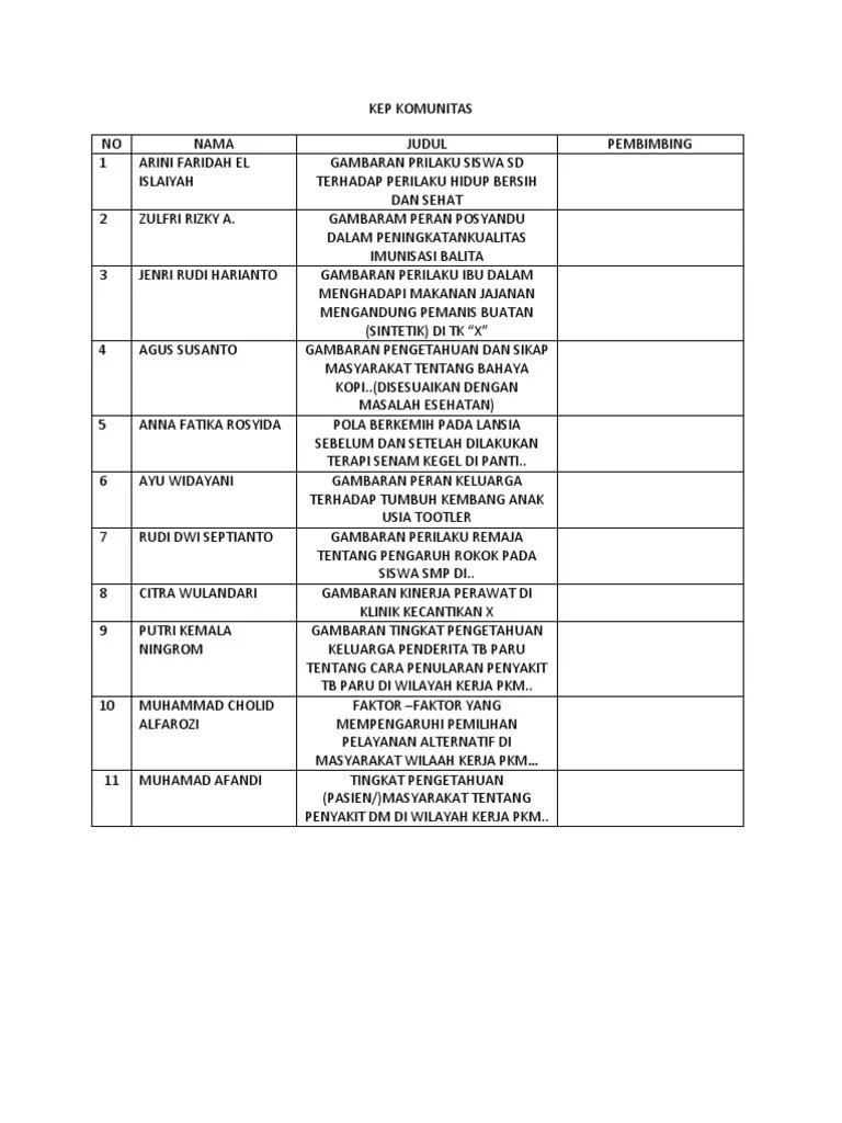 judul skripsi kesehatan masyarakat / keperawatan keluarga/ komunitas/ gerontik cara lihat ringkasan : Temukan judul skripsi/kti yang paling mudah. Wahidin sudirohodo makassar tahun 2017. Daftar judul berikut ini bukan saja sebagai contoh judul skripsi keperawatan, namun kami telah menyiapkan file lengkap untuk setiap judulnya dalam bentuk skripsi lengkap (mulai dari halaman judul, abstrak, kata pengantar, bab i, bab ii, bab iii, bab iv, bab v sampai daftar pustaka) sehingga layak menjadi referensi atau contoh skripsi keperawatan. Read online judul skripsi keperawatan medikal bedahluka diabetic di rsup dr. Kumpulan judul contoh skripsi keperawatan. Ini tentu dapat menghemat waktu anda mencari. Sekolah tinggi ilmu kesehatan dharma husada bandung. Contoh judul skripsi keperawatan terbaru mudah dikerjakan kumpulan contoh judul proposal skripsi keperawatan untuk temen temen mahasiswa jurusan keperawatan. judul skripsi keperawatan komunitas terbaru. Kumpulan skripsi asuhan keperawatan pdf lengkap terbaru Hubungan motivasi dengan penerapan komunikasi terapeutik oleh perawat pada pasien di ruang rawat inap rs. By soal terbaru last updated 22 jun 2019 163.
